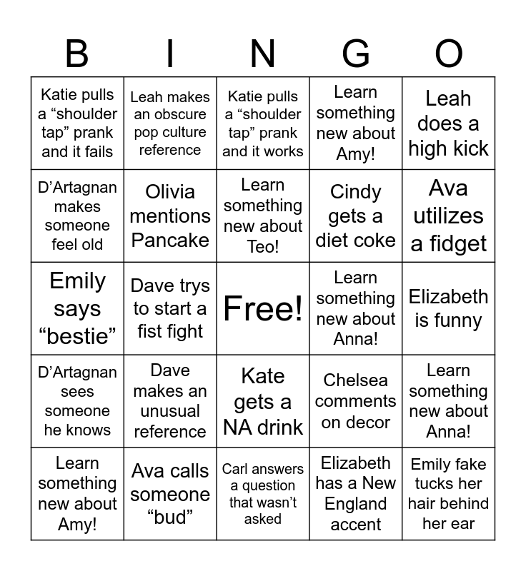 This bingo card has a free space and 27 words: Chelsea comments on decor, Chelsea cradles her pregnant belly, Cindy gets a diet coke, Carl answers a question that wasn’t asked, D’Artagnan makes someone feel old, Katie pulls a “shoulder tap” prank and it works, Leah makes an obscure pop culture reference, D’Artagnan sees someone he knows, Learn something new about Anna!, Learn something new about Anna!, Emily says “bestie”, Learn something new about Amy!, Learn something new about Amy!, Ava calls someone “bud”, Ava utilizes a fidget, Kate takes a dad stretch, Olivia mentions Pancake, Learn something new about Teo!, Dave makes an unusual reference, Katie pulls a “shoulder tap” prank and it fails, Elizabeth is funny, Elizabeth has a New England accent, Dave trys to start a fist fight, Emily fake tucks her hair behind her ear, Kate gets a NA drink, Leah does a high kick and Learn something new about Zoe!.