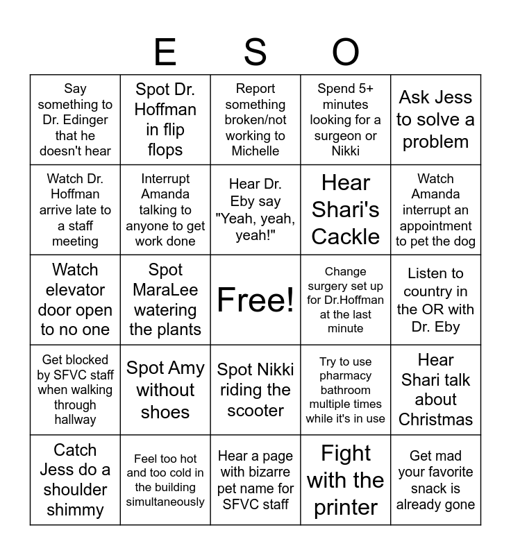 This bingo card has a free space and 24 words: Spot Amy without shoes, Feel too hot and too cold in the building simultaneously, Hear Dr. Eby say "Yeah, yeah, yeah!", Catch Jess do a shoulder shimmy, Ask Jess to solve a problem, Say something to Dr. Edinger that he doesn't hear, Watch Dr. Hoffman arrive late to a staff meeting, Spot Dr. Hoffman in flip flops, Change surgery set up for Dr.Hoffman at the last minute, Spot Nikki riding the scooter, Hear Shari's Cackle, Watch elevator door open to no one, Try to use pharmacy bathroom multiple times while it's in use, Hear Shari talk about Christmas, Interrupt Amanda talking to anyone to get work done, Fight with the printer, Listen to country in the OR with Dr. Eby, Report something broken/not working to Michelle, Watch Amanda interrupt an appointment to pet the dog, Spot MaraLee watering the plants, Get mad your favorite snack is already gone, Get blocked by SFVC staff when walking through hallway, Spend 5+ minutes looking for a surgeon or Nikki and Hear a page with bizarre pet name for SFVC staff.