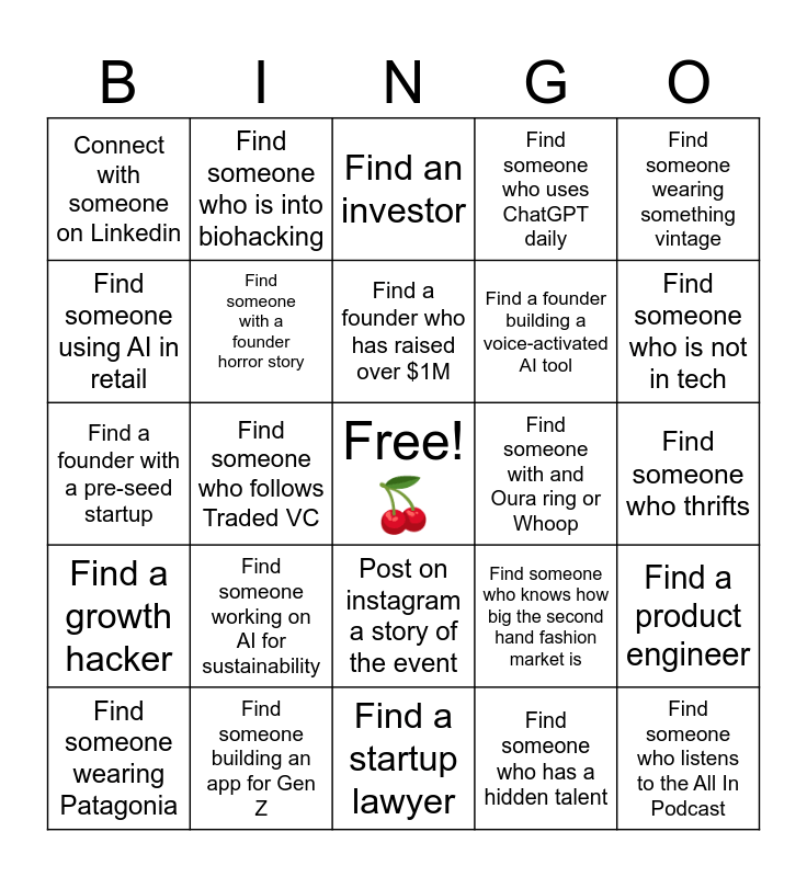This bingo card has a free space and 28 words: Find a product engineer, Find someone who went viral on tiktok, Find a founder building a voice-activated AI tool, Find someone who has a hidden talent, Find someone using AI in retail, Find an investor, Find someone who is into biohacking, Find a growth hacker, Find someone with and Oura ring or Whoop, Find someone wearing Patagonia, Find a founder with a pre-seed startup, Find someone who uses ChatGPT daily, Find someone building an app for Gen Z, Find a startup lawyer, Find someone who is not in tech, Find the founder of Cherry Pick, Find someone working on AI for sustainability, Find someone with a founder horror story, Find a founder who has raised over $1M, Post on instagram a story of the event, Connect with someone on Linkedin, Find someone who can speak more than 3 languages, Find someone who listens to the All In Podcast, Find someone who follows Traded VC, Find someone who thrifts, Find someone who knows how big the second hand fashion market is, Find someone wearing something vintage and Find someone who online shops weekly.