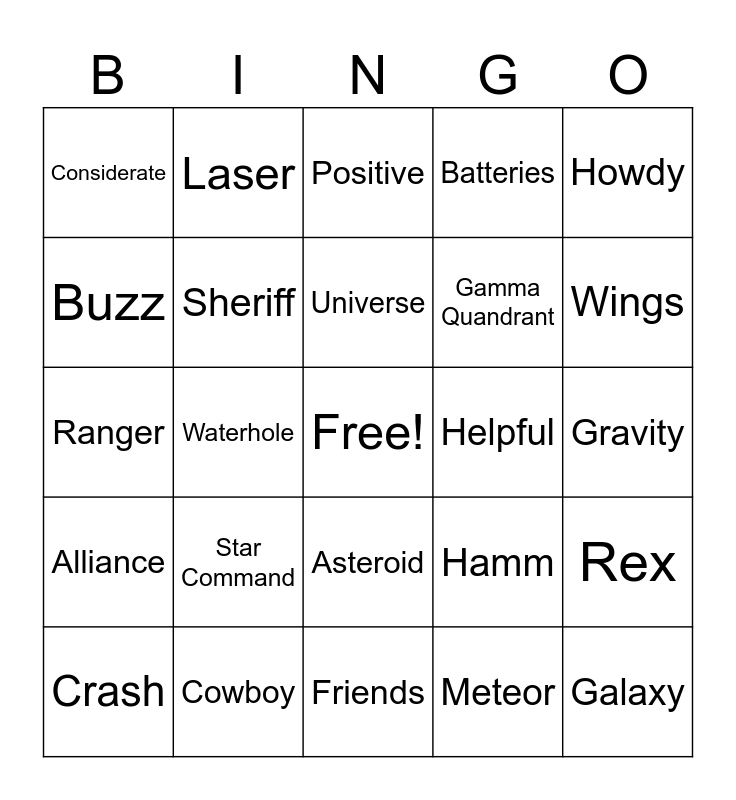 This bingo card has a free space and 54 words: Alien, Alliance, Andy, Army Men, Asteroid, Astronaut, Batteries, Bo Peep, Buzz, Comet, Considerate, Cosmos, Cowboy, Crash, Deputy, Friends, Galaxy, Gamma Quandrant, Gamma Ray, Gravity, Hamm, Helpful, Helpful, Howdy, Infinity, Laser, Laugh, Lightyear, Magnetic, Meteor, Mr Lightbeer, Mr Potato Head, Orbit, Pizza Plane, Positive, Puppy, Ranger, Rex, Rivals, Sheriff, Sid, Slinky, Smile, Spaceship, Star Command, Telescope, The Claw, Toys, Universe, Waterhole, Wings, Woody, Zoom and Zurg.