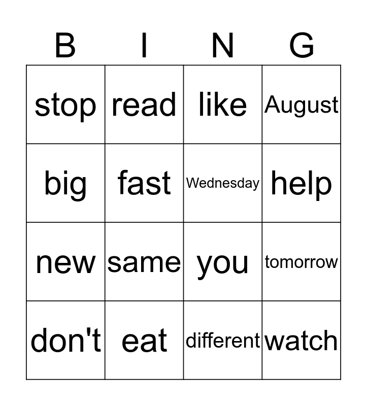 This bingo card has a free space and 15 words: don't, watch, like, stop, help, big, same, different, fast, new, tomorrow, August, Wednesday, read and eat.