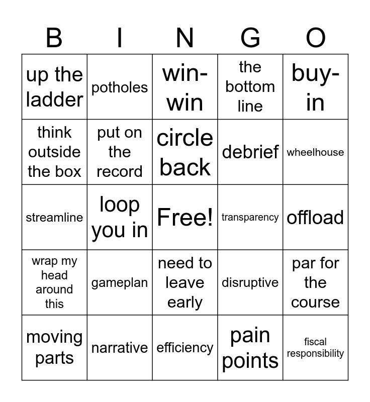 This bingo card has a free space and 34 words: bring to the table, pain points, bandwidth, strategise, wrap my head around this, put on the record, buy-in, moving parts, potholes, there seems to be a disconnect, circle back, win-win, pivot, leverage, transparency, wheelhouse, narrative, streamline, gameplan, disruptive, need to leave early, ducks in a row, up the ladder, offload, efficiency, fiscal responsibility, the bottom line, optics, debrief, think outside the box, push the envelope, loop you in, par for the course and jump start.