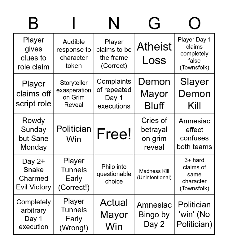 This bingo card has a free space and 24 words: Player Tunnels Early (Correct!), Player Tunnels Early (Wrong!), Complaints of repeated Day 1 executions, Completely arbitrary Day 1 execution, Player Day 1 claims completely false (Townsfolk), Player gives clues to role claim, Player claims off script role, Audible response to character token, Cries of betrayal on grim reveal, Philo into questionable choice, Demon Mayor Bluff, Rowdy Sunday but Sane Monday, Madness Kill (Unintentional), 3+ hard claims of same character (Townsfolk), Storyteller exasperation on Grim Reveal, Amnesiac Bingo by Day 2, Amnesiac effect confuses both teams, Player claims to be the frame (Correct), Slayer Demon Kill, Politician Win, Politician 'win' (No Politician), Day 2+ Snake Charmed Evil Victory, Atheist Loss and Actual Mayor Win.