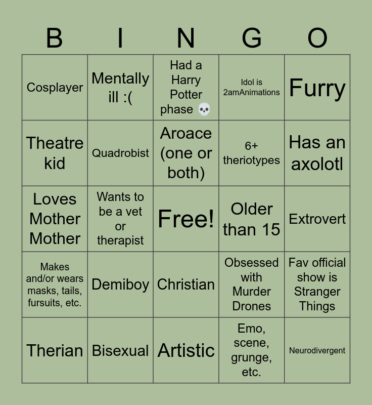 This bingo card has a free space and 24 words: Demiboy, Bisexual, Aroace (one or both), Therian, Furry, Cosplayer, Theatre kid, Mentally ill :(, Older than 15, Christian, 6+ theriotypes, Loves Mother Mother, Obsessed with Murder Drones, Fav official show is Stranger Things, Quadrobist, Emo, scene, grunge, etc., Extrovert, Had a Harry Potter phase 💀, Has an axolotl, Wants to be a vet or therapist, Neurodivergent, Makes and/or wears masks, tails, fursuits, etc., Idol is 2amAnimations and Artistic.