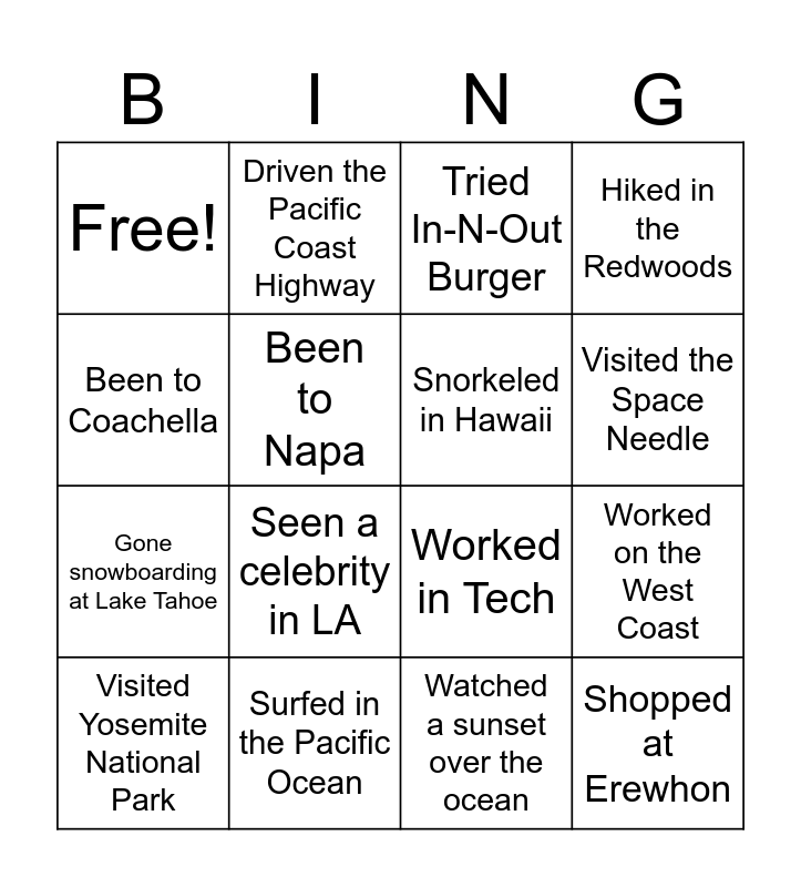 This bingo card has 16 words: Visited Yosemite National Park, Surfed in the Pacific Ocean, Tried In-N-Out Burger, Hiked in the Redwoods, Been to Coachella, Driven the Pacific Coast Highway, Worked in Tech, Worked on the West Coast, Free!, Been to Napa, Watched a sunset over the ocean, Visited the Space Needle, Gone snowboarding at Lake Tahoe, Seen a celebrity in LA, Snorkeled in Hawaii and Shopped at Erewhon.
