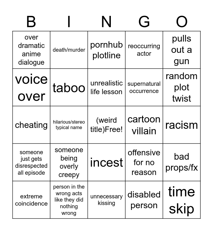 This bingo card has a free space and 24 words: someone being overly creepy, person in the wrong acts like they did nothing wrong, unrealistic life lesson, extreme coincidence, pulls out a gun, over dramatic anime dialogue, voice over, death/murder, cartoon villain, incest, supernatural occurrence, cheating, offensive for no reason, bad props/fx, taboo, disabled person, racism, pornhub plotline, random plot twist, hilarious/stereo typical name, time skip, someone just gets disrespected all episode, reoccurring actor and unnecessary kissing.