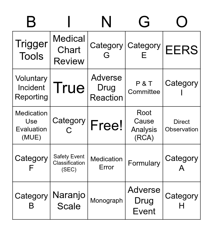 This bingo card has a free space and 26 words: Medication Error, Adverse Drug Event, Adverse Drug Reaction, Naranjo Scale, EERS, Trigger Tools, Voluntary Incident Reporting, Medical Chart Review, Direct Observation, Formulary, P & T Committee, Medication Use Evaluation (MUE), Category A, Category B, Category C, Category D, Category E, Category F, Category G, Category H, Category I, Monograph, Root Cause Analysis (RCA), Safety Event Classification (SEC), True and False.