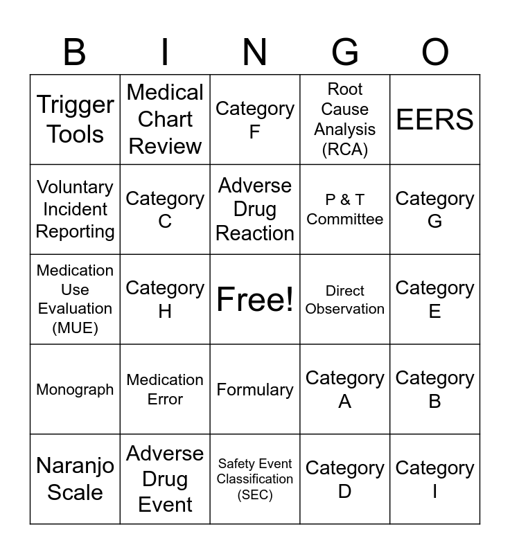 This bingo card has a free space and 24 words: Medication Error, Adverse Drug Event, Adverse Drug Reaction, Naranjo Scale, EERS, Trigger Tools, Voluntary Incident Reporting, Medical Chart Review, Direct Observation, Formulary, P & T Committee, Medication Use Evaluation (MUE), Category A, Category B, Category C, Category D, Category E, Category F, Category G, Category H, Category I, Monograph, Root Cause Analysis (RCA) and Safety Event Classification (SEC).