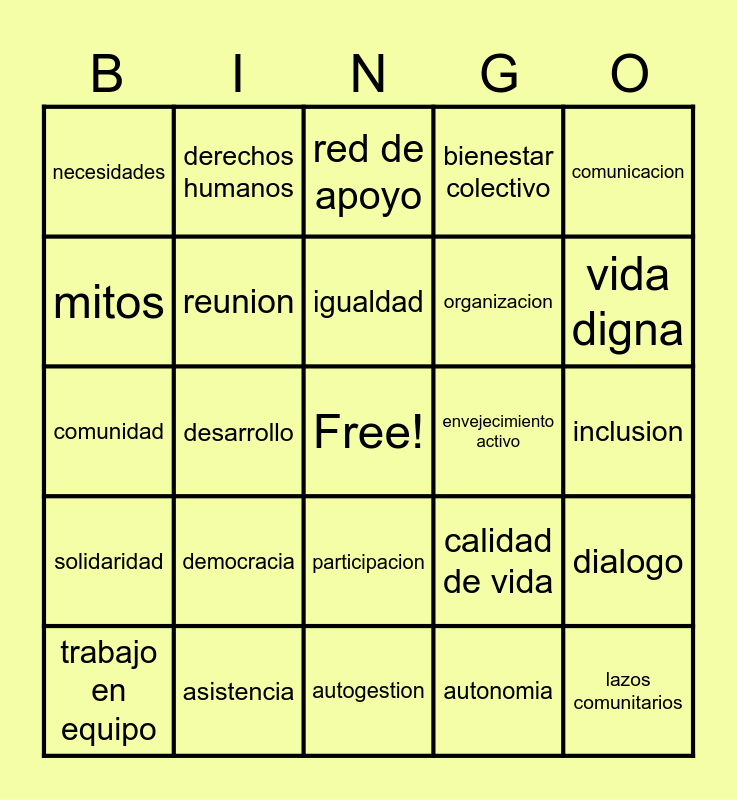 This bingo card has a free space and 24 words: democracia, asistencia, igualdad, trabajo en equipo, comunicacion, necesidades, mitos, derechos humanos, envejecimiento activo, participacion, organizacion, comunidad, calidad de vida, dialogo, reunion, autonomia, inclusion, red de apoyo, vida digna, desarrollo, lazos comunitarios, solidaridad, bienestar colectivo and autogestion.