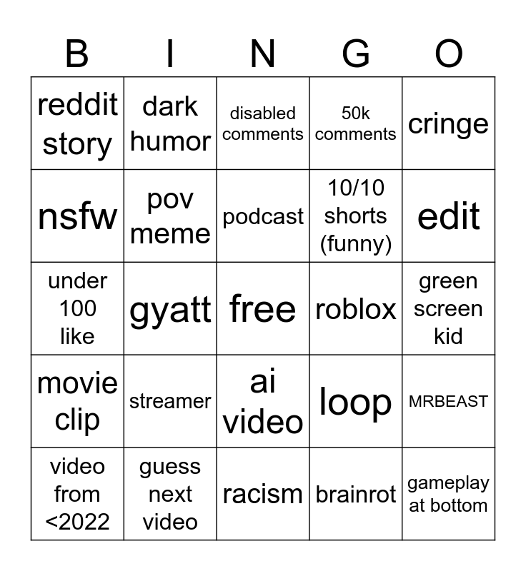 This bingo card has a free space and 24 words: video from <2022, streamer, podcast, brainrot, cringe, reddit story, dark humor, disabled comments, roblox, green screen kid, under 100 like, pov meme, loop, MRBEAST, nsfw, guess next video, racism, 50k comments, edit, movie clip, gyatt, ai video, 10/10 shorts (funny) and gameplay at bottom.