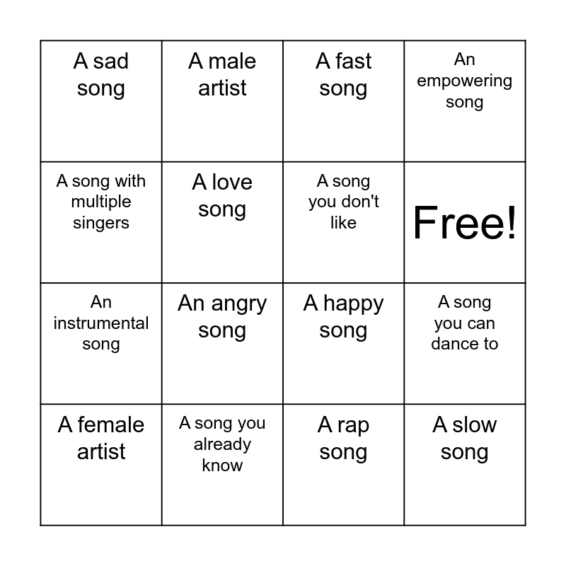 This bingo card has 18 words: An angry song, A slow song, A fast song, A sad song, A happy song, An empowering song, A female artist, A male artist, Free!, An instrumental song, A rap song, A song with multiple singers, A song you can dance to, A love song, A song you don't like, A song you like, A song you already know and A song you don't know.