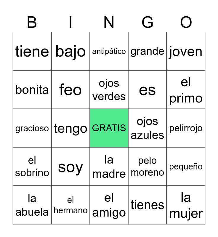 This bingo card has a free space and 49 words: el hombre, la mujer, el chico, el amigo, soy, alto, bajo, delgado, bonita, guapo, feo, grande, pequeño, pelo moreno, pelo rubio, pelo canoso, ojos verdes, ojos azules, viejo, joven, tengo, tienes, tiene, es, eres, el primo, la abuela, el tío, la madre, el sobrino, la sobrina, el hijo, la hija, la hermana, el hermano, los hermanos, el novio, la novia, pelirrojo, ¿Cómo eres?, ojos castaños, muy, atrevido, simpático, gracioso, antipático, el padre, espontáneo and estudioso.