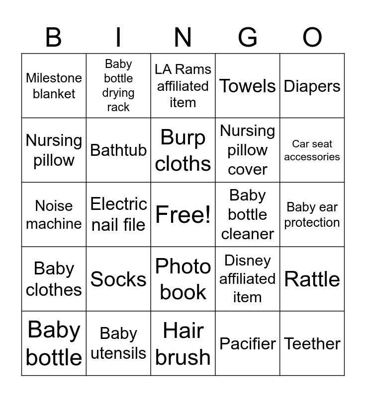 This bingo card has a free space and 36 words: Baby wipes, Clothes bag, Baby toys, Bathtub, Disney affiliated item, Baby clothes, Burp cloths, Harry Potter affiliated item, Diapers, Baby books, Electric nail file, Towels, Baby monitor, Baby bottle cleaner, Car seat accessories, Milestone blanket, Thermometer, Socks, Teether, LA Rams affiliated item, Baby ear protection, Rattle, Baby utensils, Baby bottle, Hair brush, Baby bottle drying rack, Noise machine, Swaddle, Nursing pillow cover, Nursing pillow, Diaper bag, Bassinet, Pacifier, Photo book, Hats and Diaper caddy.
