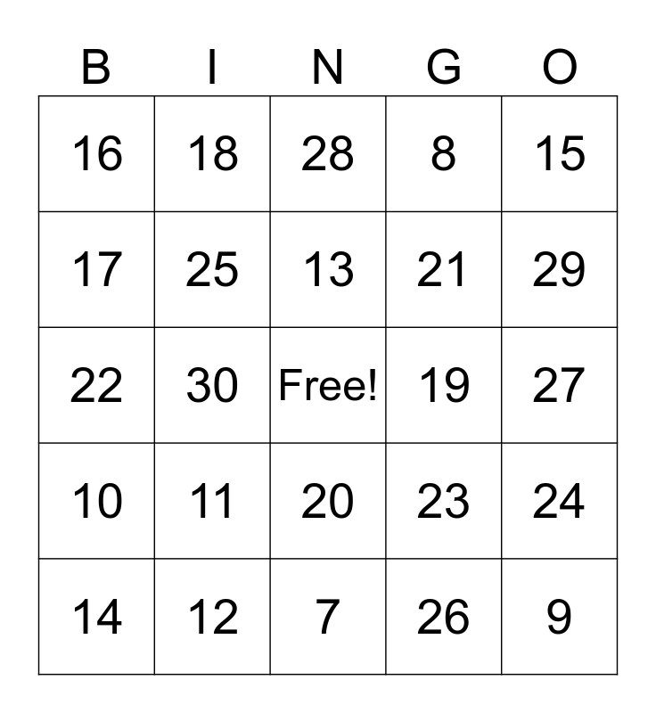 This bingo card has a free space and 24 words: 11, 12, 13, 14, 15, 16, 17, 18, 19, 20, 21, 22, 23, 24, 25, 26, 27, 28, 29, 30, 9, 10, 8 and 7.