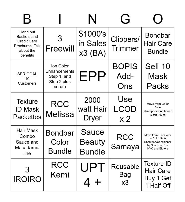 This bingo card has a free space and 24 words: Bondbar Color Bundle, RCC Kemi, EPP, 3 IROIRO, Bondbar Hair Care Bundle, Hand out Baskets and Credit Card Brochures. Talk about the benefits, SBR GOAL 10 Customers, 3 Freewill, Use LCOD x 2, Sauce Beauty Bundle, BOPIS Add-Ons, Texture ID Mask Packettes, RCC Samaya, Move from Hair Color to Color Safe Shampoo/Conditioner by Soapbox, Eva NYC and Biotera, Ion Color Enhancements Step 1, and Step 2 plus serum, Reusable Bag x3, Move from Color Safe shampoo/conditioner to Hair color, $1000's in Sales x3 (BA), Sell 10 Mask Packs, RCC Melissa, Texture ID Hair Care Buy 1 Get 1 Half Off, Hair Mask Combo Sauce and Macadamia line, Clippers/ Trimmer and UPT 4 +.