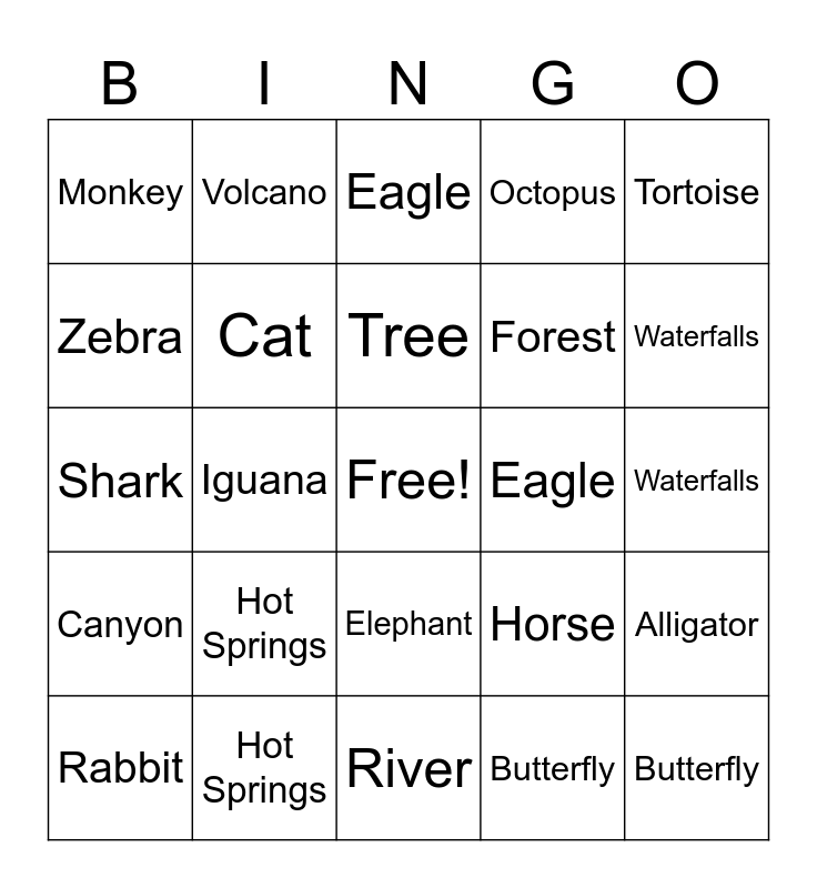 This bingo card has a free space and 52 words: Rocks, Hot Springs, River, Beach, Waterfalls, Mountain, Volcano, Tree, Forest, Rabbit, Shark, Dolphin, Butterfly, Alligator, Cat, Snake, Eagle, Horse, Monkey, Zebra, Iguana, Elephant, Octopus, Tortoise, Whale, Rabbit, Shark, Dolphin, Eagle, Butterfly, Alligator, Cat, Snake, Elephant, Horse, Monkey, Zebra, Iguana, Whale, Octopus, Rocks, Hot Springs, River, Beach, Waterfalls, Mountain, Volcano, Tree, Forest, Lake, Canyon and Cave.