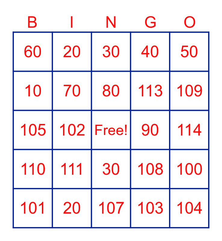 This bingo card has a free space and 29 words: 10, 20, 30, 40, 50, 60, 70, 80, 90, 100, 101, 102, 103, 104, 105, 106, 107, 108, 109, 110, 111, 112, 113, 114, 10, 20, 30, 40 and 50.