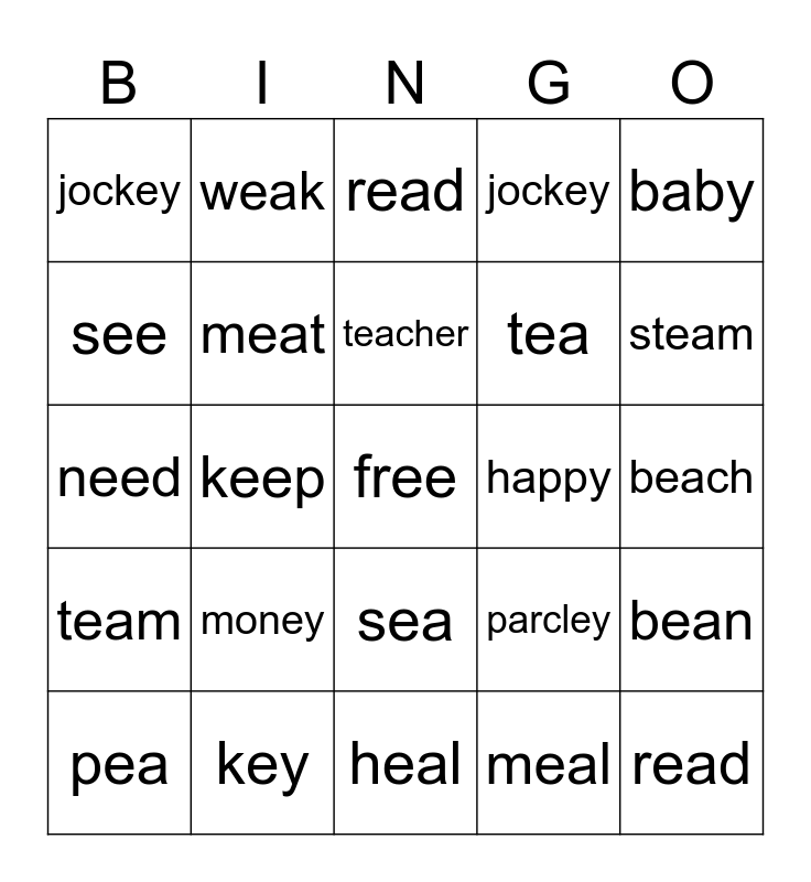 This bingo card has a free space and 24 words: money, key, teacher, pea, baby, jockey, see, weak, happy, sea, tea, need, parcley, bean, meat, meal, beach, read, steam, keep, read, team, jockey and heal.