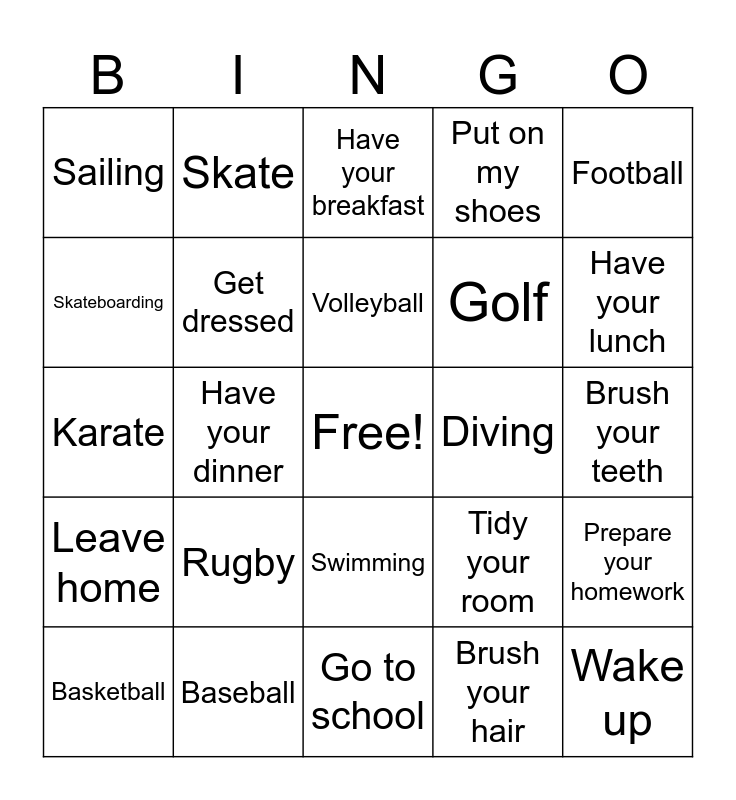This bingo card has a free space and 24 words: Rugby, Baseball, Volleyball, Basketball, Football, Sailing, Skateboarding, Skate, Diving, Swimming, Golf, Karate, Tidy your room, Prepare your homework, Get dressed, Brush your hair, Brush your teeth, Have your breakfast, Have your lunch, Have your dinner, Wake up, Leave home, Put on my shoes and Go to school.