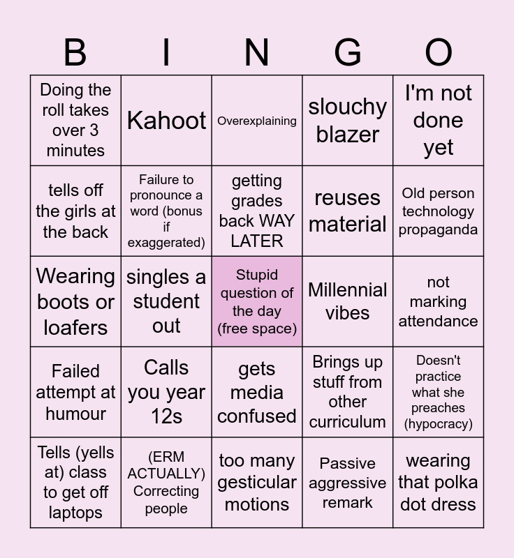 This bingo card has a free space and 34 words: Weird ahh fit, Passive aggressive remark, Random boring story (we don’t care), Attempting relatability, Failed attempt at humour, Failure to pronounce a word (bonus if exaggerated), I'm not done yet, Tells (yells at) class to get off laptops, Kahoot, delaying grades with excuse, getting grades back WAY LATER, Overexplaining, offering students to exit the class, Rambling with stupid tangent, Millennial vibes, Old person technology propaganda, (ERM ACTUALLY) Correcting people, Wearing boots or loafers, Calls you year 12s, Brings up stuff from other curriculum, gets media confused, Late to class, Doing the roll takes over 3 minutes, not marking attendance, too many gesticular motions, wearing that polka dot dress, slouchy blazer, "back when i was...", reuses material, tells off the girls at the back, "it's really rude", singles a student out, Doesn't practice what she preaches (hypocracy) and brings up NPCs in her life (WE DON’T CARE).