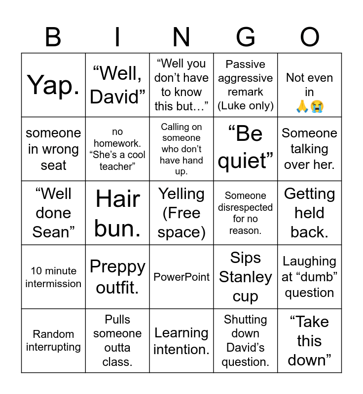 This bingo card has a free space and 24 words: Preppy outfit., Pulls someone outta class., Calling on someone who don’t have hand up., Random interrupting, Not even in 🙏😭, Yap., someone in wrong seat, “Well, David”, Someone disrespected for no reason., PowerPoint, “Be quiet”, “Well done Sean”, Sips Stanley cup, Laughing at “dumb” question, no homework. “She’s a cool teacher”, Shutting down David’s question., Getting held back., “Well you don’t have to know this but…”, Someone talking over her., Hair bun., “Take this down”, 10 minute intermission, Passive aggressive remark (Luke only) and Learning intention..