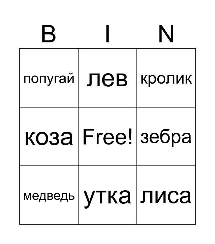 This bingo card has a free space and 16 words: кошка, собака, кролик, попугай, тигр, лев, дельфин, мышь, лиса, зебра, лягушка, коза, рыба, утка, медведь and лошадь.