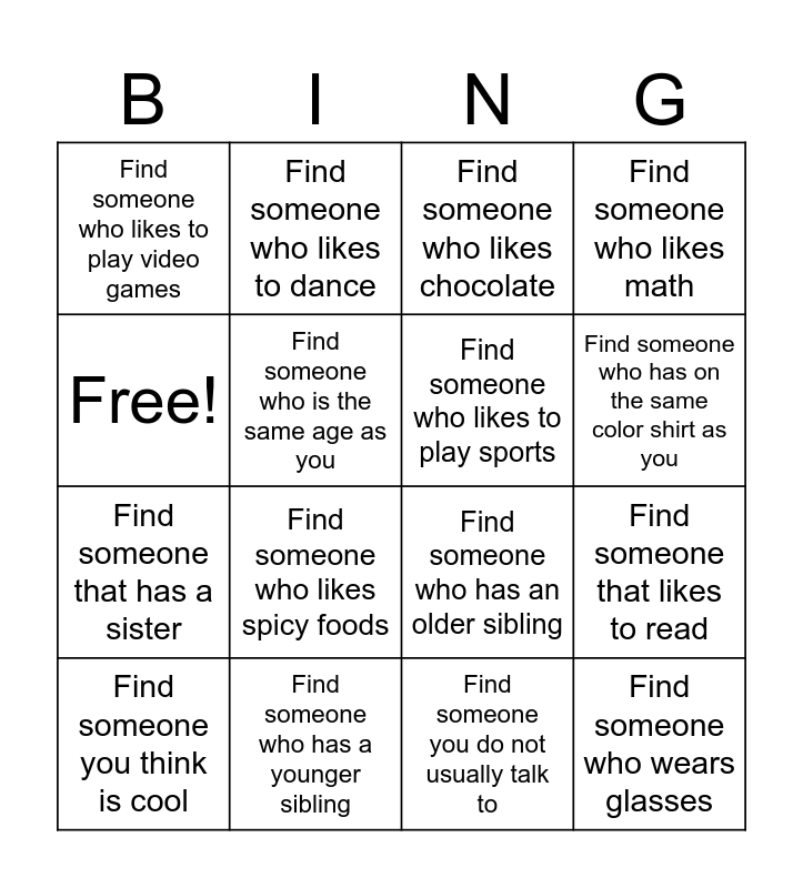 This bingo card has 16 words: Find someone who has a younger sibling, Find someone that likes to read, Find someone who likes chocolate, Find someone who likes to play video games, Find someone that has a sister, Find someone who likes to dance, Find someone who has an older sibling, Find someone you do not usually talk to, Free!, Find someone who is the same age as you, Find someone you think is cool, Find someone who likes math, Find someone who likes spicy foods, Find someone who has on the same color shirt as you, Find someone who likes to play sports and Find someone who wears glasses.