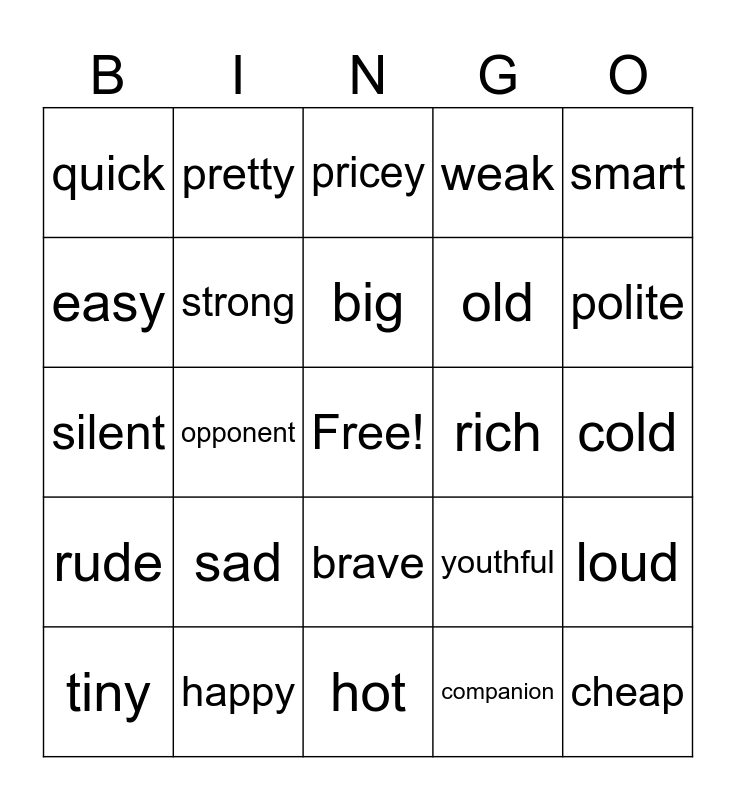 This bingo card has a free space and 24 words: sad, happy, big, tiny, smart, quick, easy, pretty, rich, brave, old, silent, youthful, loud, strong, companion, cold, pricey, polite, opponent, cheap, rude, weak and hot.
