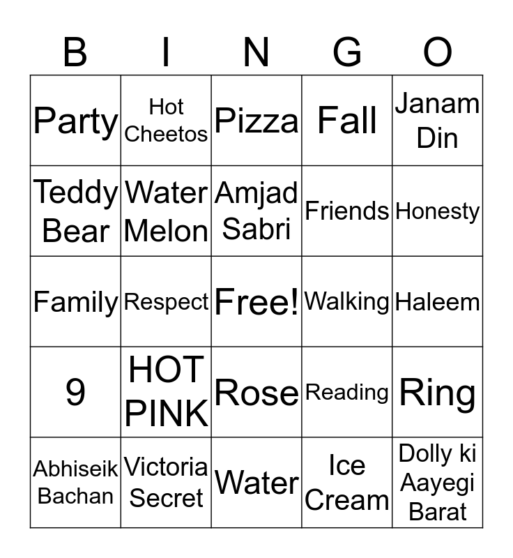 This bingo card has a free space and 24 words: HOT PINK, Victoria Secret, Amjad Sabri, Abhiseik Bachan, Janam Din, Party, Teddy Bear, Hot Cheetos, Walking, Rose, Friends, Family, Reading, Ring, Water Melon, Ice Cream, Haleem, Pizza, Honesty, Respect, Dolly ki Aayegi Barat, 9, Fall and Water.