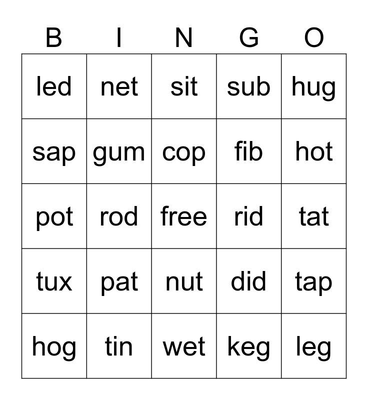 This bingo card has a free space and 24 words: pat, tin, cop, hog, hug, led, sap, net, rid, nut, fib, pot, did, tap, gum, keg, tat, sit, hot, rod, leg, tux, sub and wet.