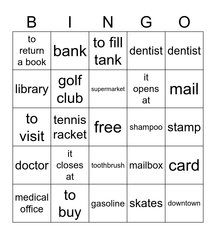 This bingo card has a free space and 24 words: it closes at, to buy, supermarket, medical office, dentist, to return a book, library, bank, shampoo, toothbrush, it opens at, to visit, mailbox, card, golf club, skates, stamp, to fill tank, mail, tennis racket, downtown, doctor, dentist and gasoline.