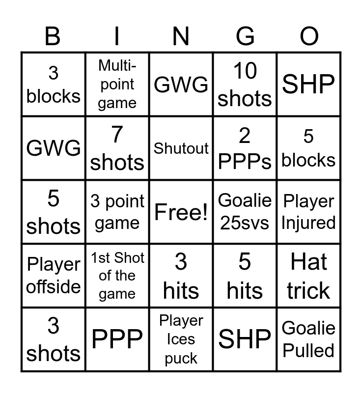 This bingo card has a free space and 24 words: 1st Shot of the game, PPP, Shutout, 3 shots, SHP, 3 blocks, GWG, Multi-point game, Goalie 25svs, 3 hits, 2 PPPs, 5 shots, 5 hits, Hat trick, 7 shots, SHP, Player Injured, GWG, 5 blocks, 3 point game, Goalie Pulled, Player offside, 10 shots and Player Ices puck.