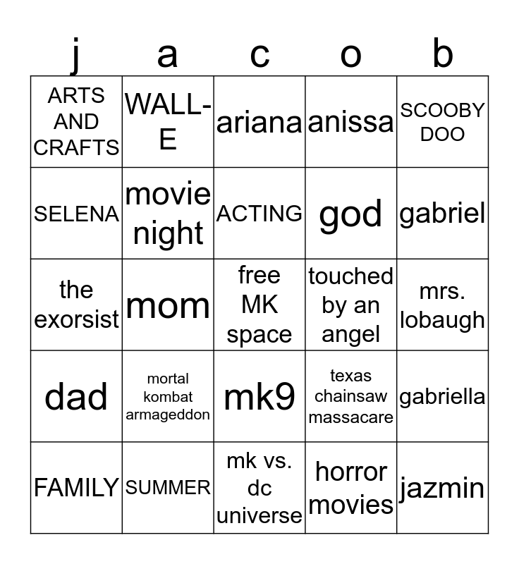 This bingo card has a free space and 24 words: mortal kombat armageddon, SUMMER, ACTING, FAMILY, SCOOBY DOO, ARTS AND CRAFTS, SELENA, WALL-E, touched by an angel, mk9, god, the exorsist, texas chainsaw massacare, gabriella, movie night, horror movies, mrs. lobaugh, ariana, gabriel, mom, jazmin, dad, anissa and mk vs. dc universe.