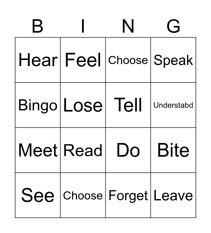 This bingo card has 16 words: Choose, Bite, Choose, Hear, Meet, Feel, Do, Forget, Bingo, Lose, See, Speak, Read, Understabd, Tell and Leave.