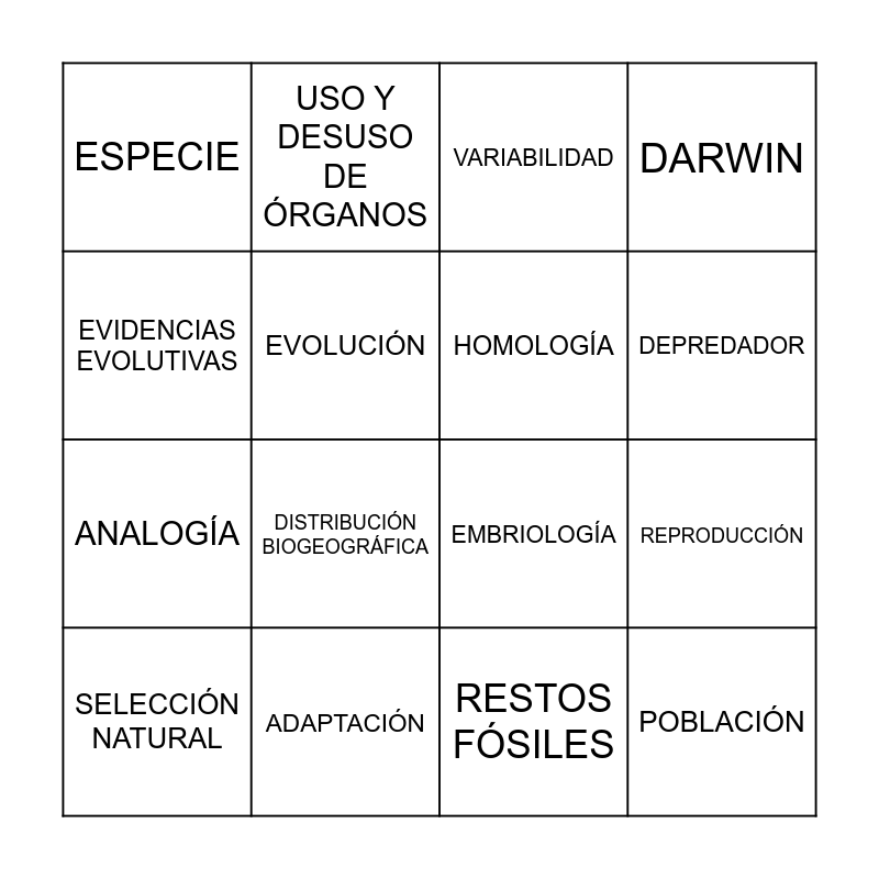 BINGO EVOLUTIVO | BINGO EVOLUTIVO | CONVOCATORIAS SUSTANTIVOS ABSTRACTOS | Prácticas educativas innovadoras | BIOLOGÍA EVOLUTIVA
