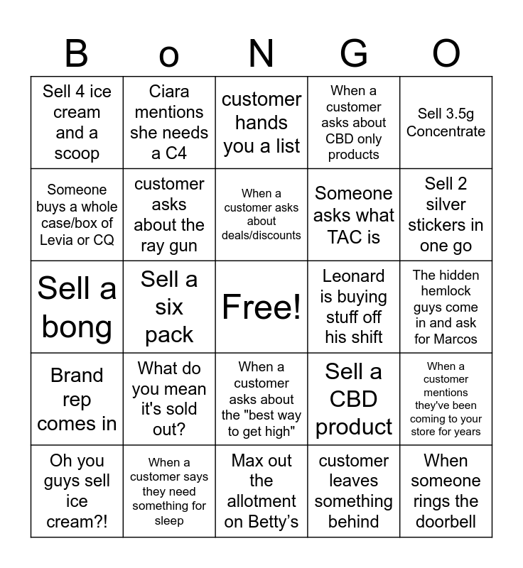 This bingo card has a free space and 49 words: ATM fee complaint, When someone rings the doorbell, If you get a manny fist bump, Max out the allotment on Betty’s, What do you mean it's sold out?, When a customer mentions they're a first-time user, Ciara mentions she needs a C4, Want’s Highest TAC, Someone buys a whole case/box of Levia or CQ, Sell to someone who is treating their pet (Pet Drops), customer asks about the ray gun, When a customer asks about CBD only products, When a customer mentions they've been coming to your store for years, Sell a CBD product, Sell a 2g vape pen, Doesn’t scan, Means it’s free right?, When a customer asks about deals/discounts, Leonard is buying stuff off his shift, When a customer lets you pick out their whole order, Sell 3.5g Concentrate, Sell a six pack, customer leaves something behind, Sell 4 ice cream and a scoop, Someone asks what TAC is, A vendor brings in donuts, Sell 2 silver stickers in one go, Oh you guys sell ice cream?!, Sell to someone using cannabis for medicinal purposes (e.g., chronic pain, anxiety), When a customer asks about the "best way to get high", Brand rep comes in, Sell a full oz of flower, Someone asks for any pre roll or flower with the highest TAC, You sell a bong, Sell to someone celebrating their birthday, When a customer says they need something for sleep, When you make small talk with someone who only wants to buy one thing, Customer says “i just made those this morning”, Sell a glass cup, The hidden hemlock guys come in and ask for Marcos, Sell 2 add ons, When a customer has a funny joke or pun related to cannabis, When a customer does a "happy dance" in the store, Customer tries to use a credit card, When a customer asks about Sativa vs Indica, Sell a bong, customer hands you a list, Dog!, Bathroom light doesn’t turn on and Max out on Concentrates.