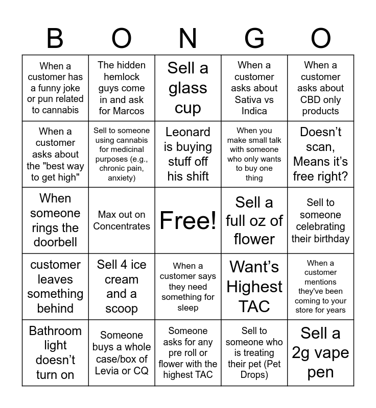 This bingo card has a free space and 49 words: Max out the allotment on Betty’s, Sell a 2g vape pen, Sell a six pack, Someone asks for any pre roll or flower with the highest TAC, Sell 4 ice cream and a scoop, Someone asks what TAC is, The hidden hemlock guys come in and ask for Marcos, What do you mean it's sold out?, When a customer asks about the "best way to get high", Sell a CBD product, Sell to someone using cannabis for medicinal purposes (e.g., chronic pain, anxiety), When a customer asks about Sativa vs Indica, When a customer mentions they've been coming to your store for years, Want’s Highest TAC, If you get a manny fist bump, You sell a bong, Leonard is buying stuff off his shift, Sell a full oz of flower, Ciara mentions she needs a C4, When a customer asks about CBD only products, Max out on Concentrates, Sell to someone who is treating their pet (Pet Drops), When a customer has a funny joke or pun related to cannabis, When you make small talk with someone who only wants to buy one thing, When a customer asks about deals/discounts, Doesn’t scan, Means it’s free right?, Bathroom light doesn’t turn on, When a customer does a "happy dance" in the store, When a customer says they need something for sleep, customer leaves something behind, When a customer mentions they're a first-time user, Sell 3.5g Concentrate, Oh you guys sell ice cream?!, customer asks about the ray gun, Someone buys a whole case/box of Levia or CQ, A vendor brings in donuts, Sell a bong, Dog!, Sell to someone celebrating their birthday, Brand rep comes in, Sell 2 silver stickers in one go, ATM fee complaint, Customer says “i just made those this morning”, When a customer lets you pick out their whole order, When someone rings the doorbell, Sell a glass cup, Sell 2 add ons, Customer tries to use a credit card and customer hands you a list.