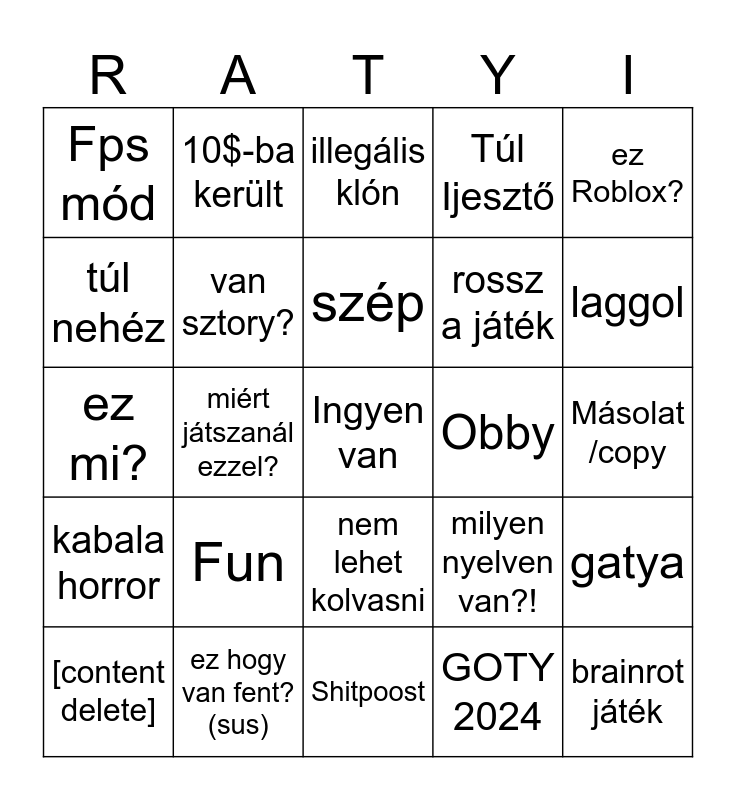 This bingo card has a free space and 24 words: Fun, ez hogy van fent? (sus), szép, [content delete], ez Roblox?, Fps mód, túl nehéz, 10$-ba került, Obby, nem lehet kolvasni, rossz a játék, ez mi?, milyen nyelven van?!, gatya, van sztory?, GOTY 2024, Másolat /copy, illegális klón, laggol, miért játszanál ezzel?, brainrot játék, kabala horror, Túl Ijesztő and Shitpoost.