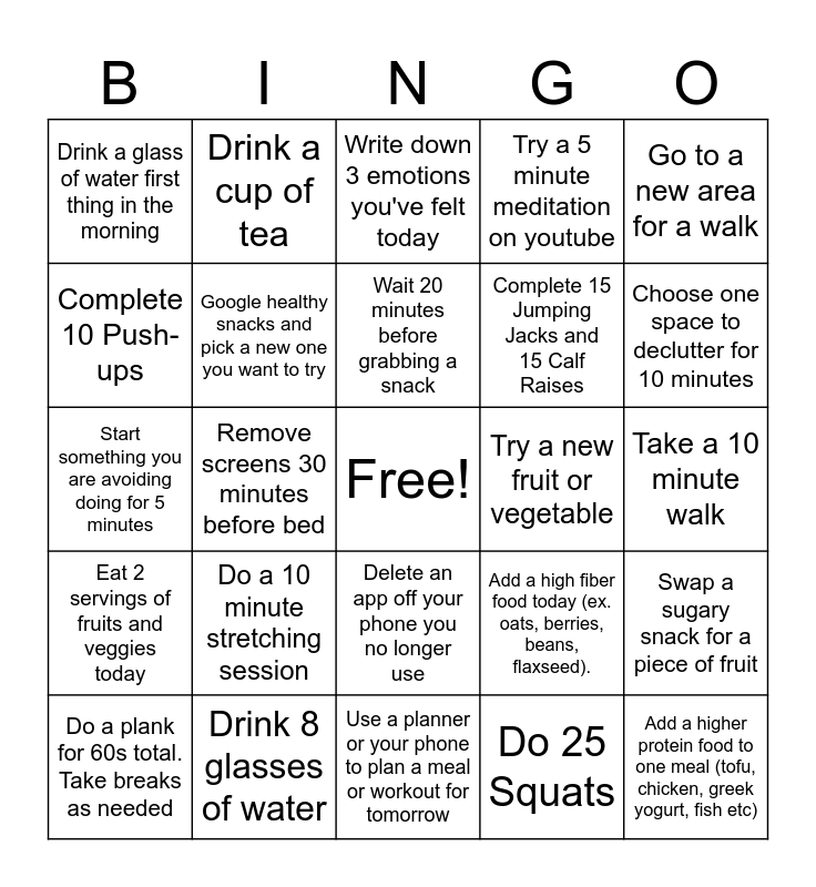 This bingo card has a free space and 24 words: Do a 10 minute stretching session, Drink 8 glasses of water, Wait 20 minutes before grabbing a snack, Do a plank for 60s total. Take breaks as needed, Go to a new area for a walk, Drink a glass of water first thing in the morning, Complete 10 Push-ups, Drink a cup of tea, Try a new fruit or vegetable, Delete an app off your phone you no longer use, Complete 15 Jumping Jacks and 15 Calf Raises, Start something you are avoiding doing for 5 minutes, Add a high fiber food today (ex. oats, berries, beans, flaxseed)., Swap a sugary snack for a piece of fruit, Google healthy snacks and pick a new one you want to try, Do 25 Squats, Take a 10 minute walk, Write down 3 emotions you've felt today, Choose one space to declutter for 10 minutes, Remove screens 30 minutes before bed, Add a higher protein food to one meal (tofu, chicken, greek yogurt, fish etc), Eat 2 servings of fruits and veggies today, Try a 5 minute meditation on youtube and Use a planner or your phone to plan a meal or workout for tomorrow.