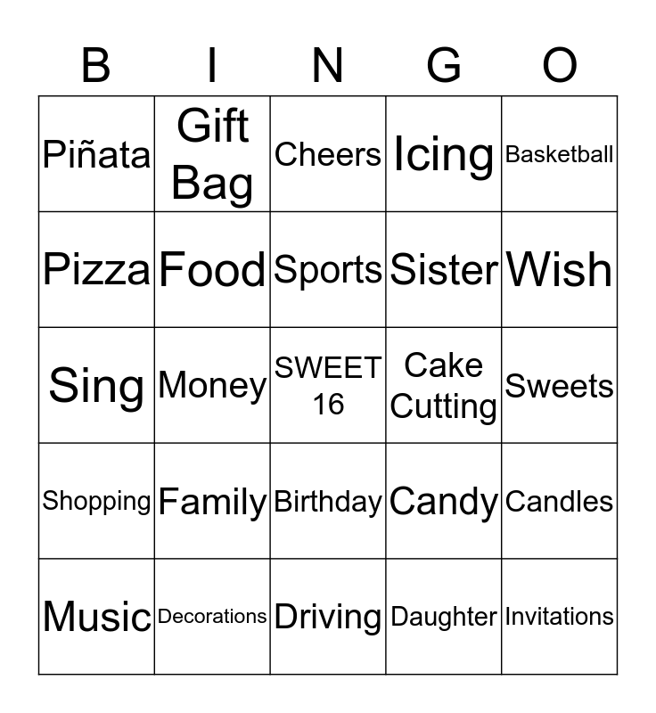 This bingo card has a free space and 28 words: Candles, Born, Sister, Daughter, Pizza, Cheers, Gift Bag, Shopping, Cake Cutting, Music, Sing, Icing, Decorations, Driving, Wish, Cake, Family, Food, Sports, Birthday, Piñata, Games, Invitations, Money, Sweets, Candy, Basketball and Hoops.