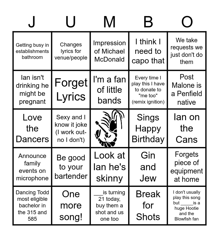 This bingo card has a free space and 32 words: Break for Shots, Mouth Trumpet, Sexy and I know it joke (I work out-no I don't), Woke up and I thought I was 300lbs, Announce family events on microphone, Forget Lyrics, We take requests we just don't do them, Forgets piece of equipment at home, Changes lyrics for venue/people, Mentions buying an old sailboat, I'm a fan of little bands, Impression of Michael McDonald, Calling someone else on stage, The more you drink the better we sound., Sings Happy Birthday, Bud Light Girls joke, Dancing Todd most eligible bachelor in the 315 and 585, Love the Dancers, Look at Ian he's skinny, Be good to your bartender, Gin and Jew, Be good to your bartender, Ian on the Cans, One more song!, I don't usually play this song but _____is a huge Hootie and the Blowfish fan, I think I need to capo that, Every time I play this I have to donate to "me too" (remix ignition), Ian isn't drinking he might be pregnant, Getting busy in establishments bathroom, ___is turning 21 today, buy them a shot and us one too, Best dressed person in the house (wearing JS t shirt) and Post Malone is a Penfield native.