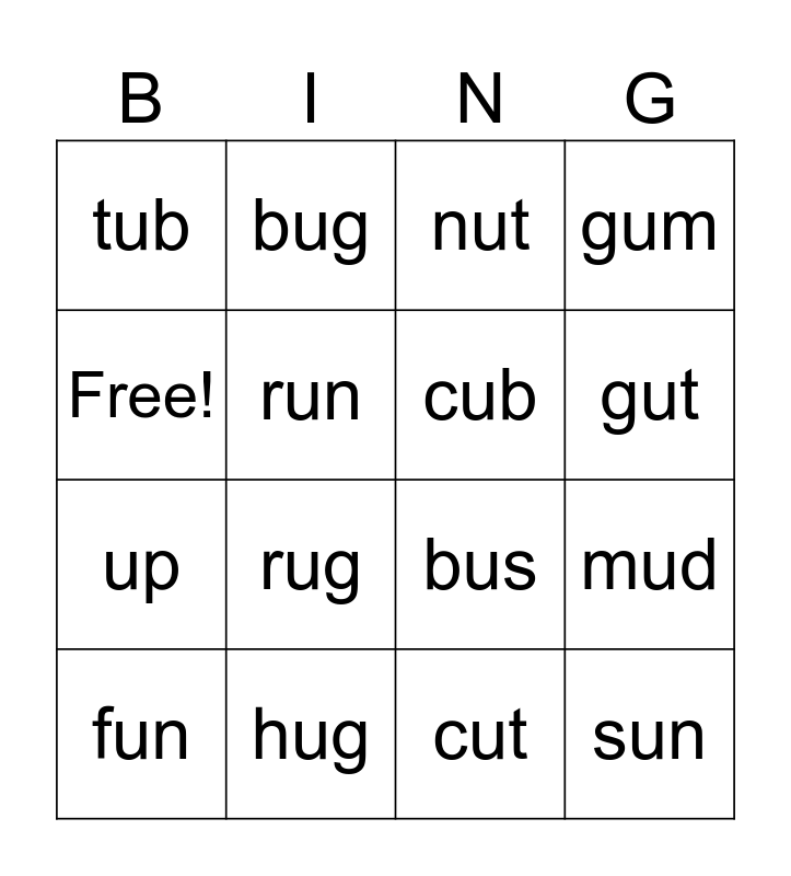 This bingo card has 16 words: hug, mud, nut, tub, up, bug, bus, cut, Free!, run, fun, gum, rug, gut, cub and sun.