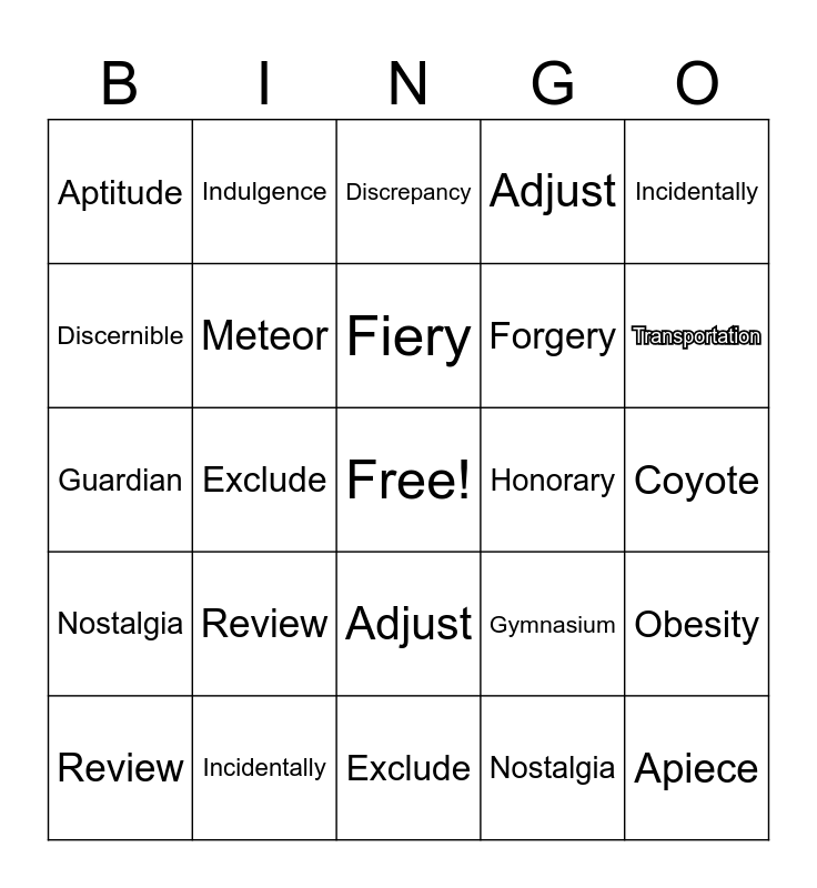 This bingo card has a free space and 50 words: Malicious, Incidentally, Desolate, Nostalgia, Obesity, Extricate, Indulgence, Fiery, Forgery, Criticism, Discernible, Meteor, Gymnasium, Apiece, Hygiene, Guardian, Discrepancy, Honorary, Telescope, Aptitude, Review, Exclude, Adjust, Transportation, Malicious, Indulgence, Fiery, Meteor, Incidentally, Nostalgia, Obesity, Extricate, Desolate, Forgery, Criticism, Discernible, Gymnasium, Discrepancy, Honorary, Guardian, Apiece, Hygiene, Telescope, Aptitude, Review, Exclude, Adjust, Transportation, Coyote and Boulevard.