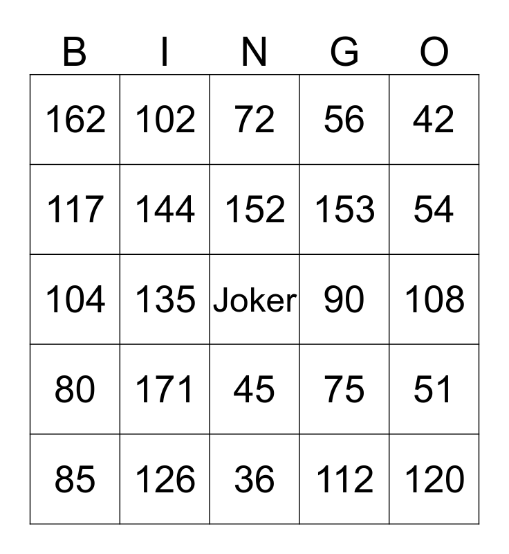 This bingo card has a free space and 24 words: 171, 126, 152, 85, 42, 162, 117, 102, 90, 45, 153, 104, 75, 51, 144, 112, 108, 72, 54, 135, 120, 80, 56 and 36.