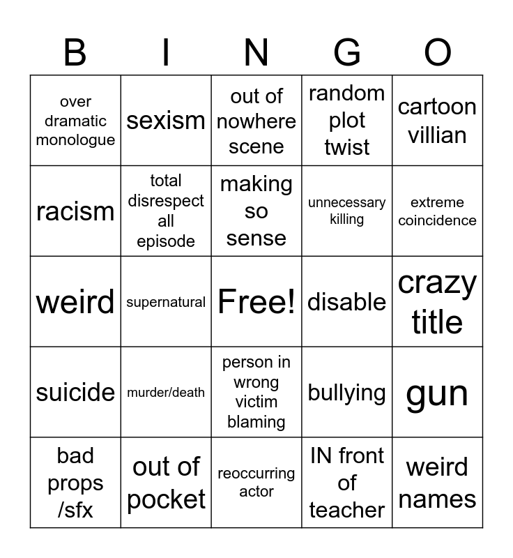 This bingo card has a free space and 24 words: murder/death, out of pocket, making so sense, bad props /sfx, cartoon villian, over dramatic monologue, racism, sexism, disable, person in wrong victim blaming, unnecessary killing, weird, bullying, gun, total disrespect all episode, IN front of teacher, crazy title, out of nowhere scene, extreme coincidence, supernatural, weird names, suicide, random plot twist and reoccurring actor.