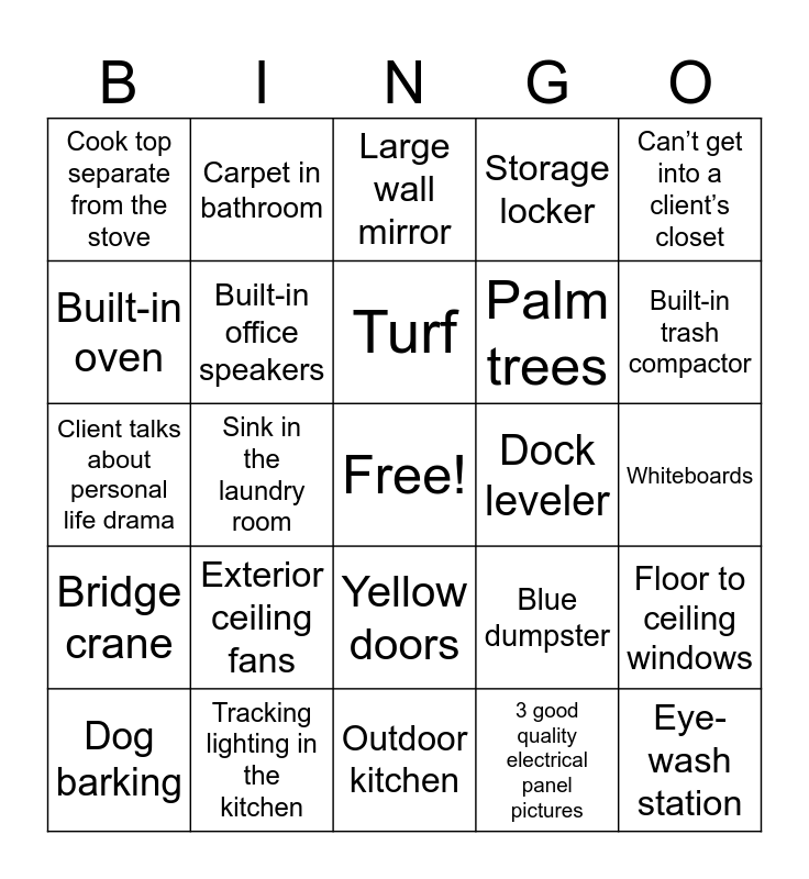 This bingo card has a free space and 25 words: Exterior ceiling fans, Outdoor kitchen, Turf, Dog barking, Can’t get into a client’s closet, Cook top separate from the stove, Built-in oven, Carpet in bathroom, Dock leveler, Yellow doors, Palm trees, Client talks about personal life drama, Blue dumpster, Floor to ceiling windows, Built-in office speakers, Rubber flooring, Whiteboards, Large wall mirror, Built-in trash compactor, Sink in the laundry room, Eye-wash station, Tracking lighting in the kitchen, Bridge crane, Storage locker and 3 good quality electrical panel pictures.