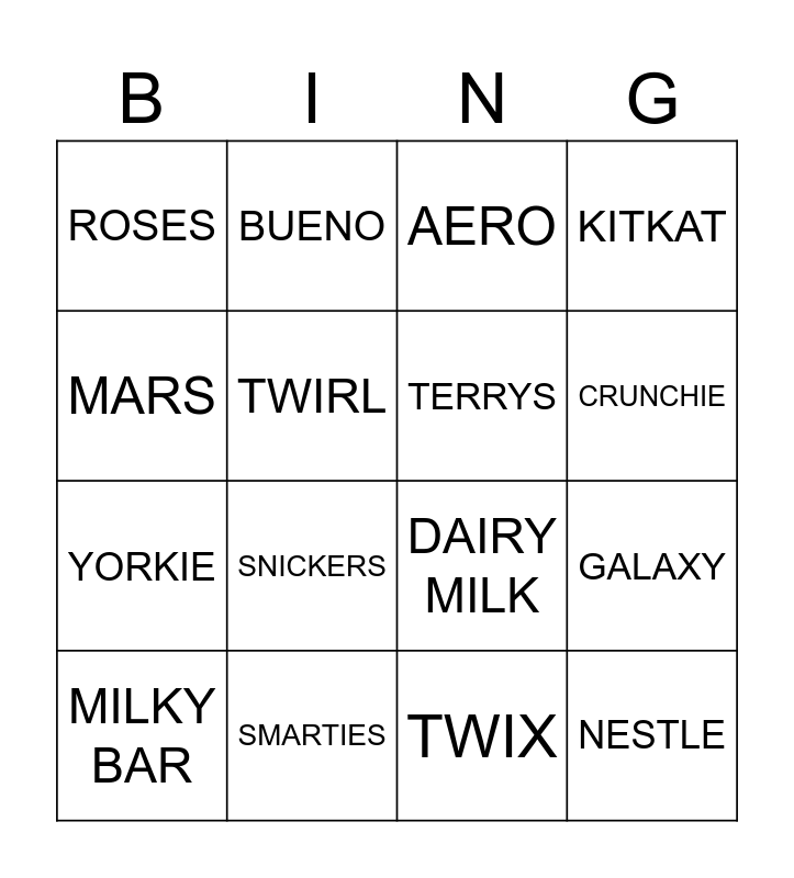 This bingo card has 16 words: SMARTIES, GALAXY, AERO, ROSES, YORKIE, BUENO, DAIRY MILK, TWIX, MARS, TWIRL, MILKY BAR, KITKAT, SNICKERS, CRUNCHIE, TERRYS and NESTLE.