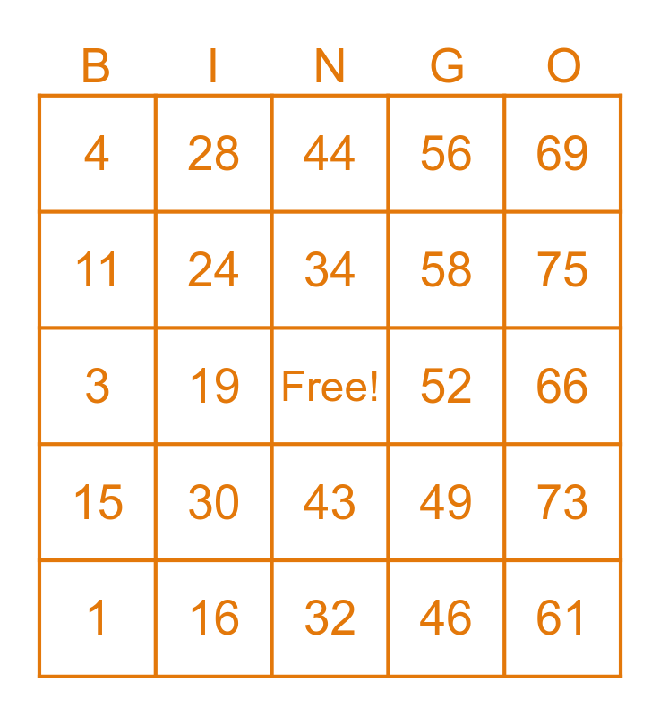 This bingo card has a free space and 24 words: 1, 30, 34, 46, 69, 4, 28, 44, 52, 66, 3, 24, 49, 73, 11, 16, 32, 56, 75, 15, 19, 43, 58 and 61.