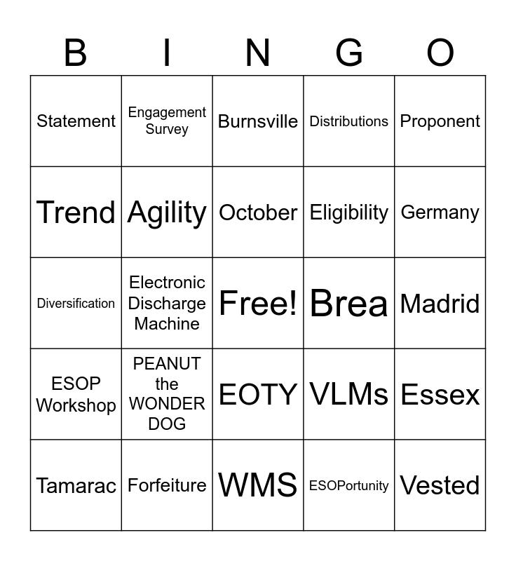 This bingo card has a free space and 58 words: Intelligence, Forfeiture, Core Values, ESOP Workshop, ESOPortunity, Shares, Agility, Ownership, Eligibility, Luncheon, Distributions, Trust, S-Corp, APAC, EMEA, Statement, Vested, Proponent, Beneficiary, October, Brea, Burnsville, Tamarac, Essex, Bordon, Madrid, Alphen, KPI, Germany, Singapore, Hong Kong, Guangzhou, Hoshin, Daily Briefing, HC Pacific, Acquisition, Helicopter Services, Electronic Discharge Machine, Diversification, MRO, PEANUT the WONDER DOG, Rockie the Tortoise, VLMs, Clean & Tidy, Battery Services, ProConnect, Innovation, EOTY, WMS, Just Do It (JDIs), EO Lounge Podcast, Summary Plan, Plan Participant, Lean Management, Engagement Survey, $1 BILLION Revenue, Trend and Cats Web.