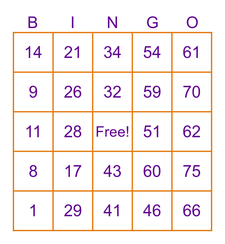 This bingo card has a free space and 24 words: 1, 17, 32, 46, 61, 14, 21, 34, 51, 62, 11, 26, 60, 75, 9, 29, 41, 54, 70, 8, 28, 43, 59 and 66.